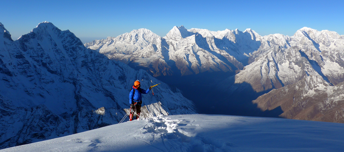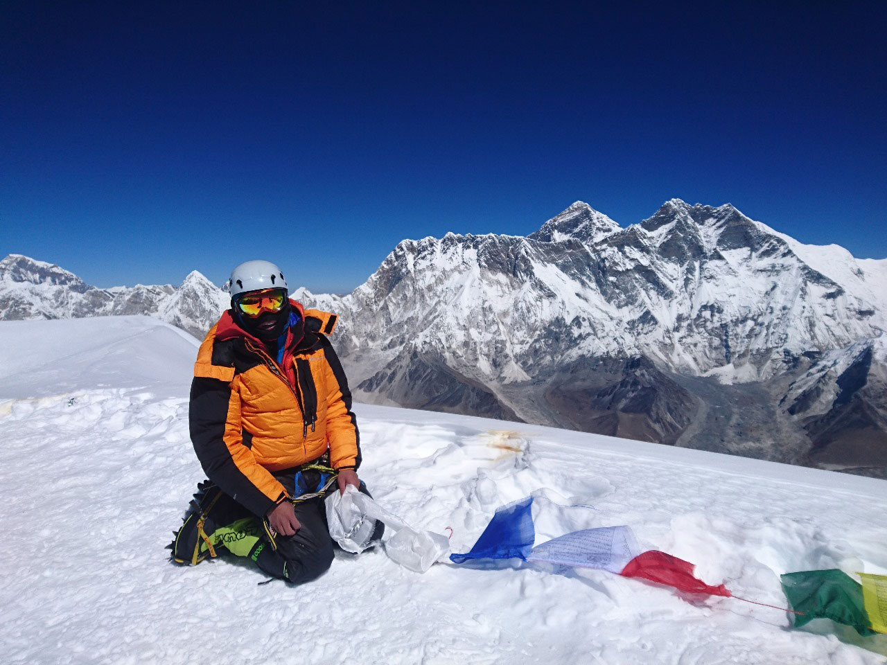 Team are near summit. Paul at the summit of AmaDablam. Photo Paul