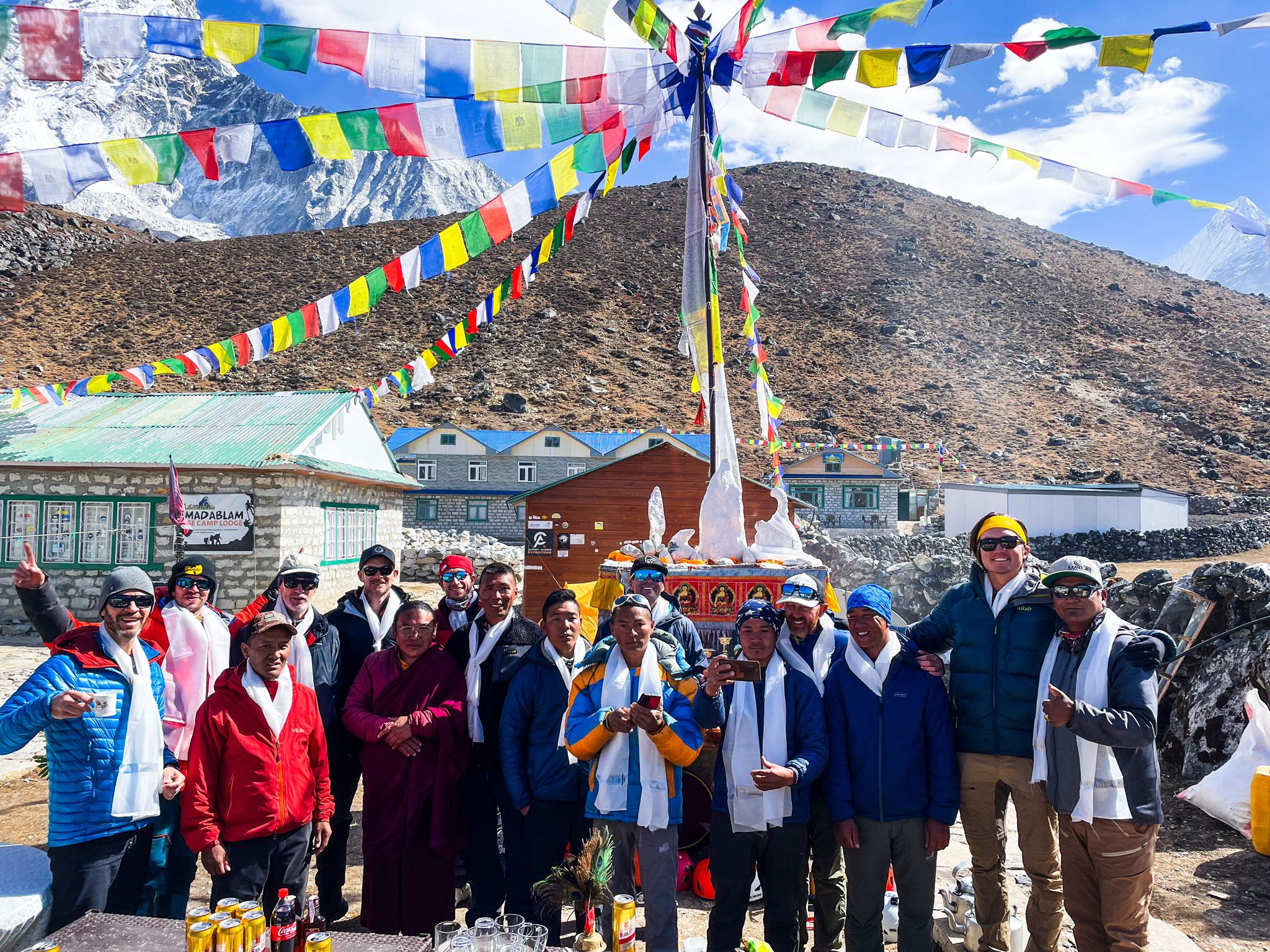 Photo caption: AmaDablam team members posing for a photo after the puja ceremony.