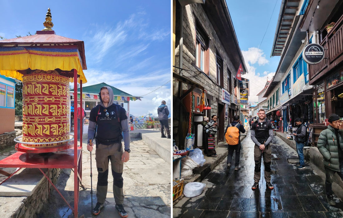 Caption : Member and Prayer wheel along the way. One of the fancy town Lukla.