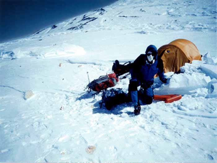 I stumbled and crawled through darkness in a howling ground blizzard, with wind blown ice grains sandblasting my now unmasked cheeks, down a never ending ice field toward a flickering distant light with hands covering my face and a dead headlamp. When I came to the tent I collapsed on hard icy snow and cried out. The door zipped open and I rolled in, crampons and all. Inside were two very surprised Russian teammates, Aleksey Klimin and Gennady Copieka. After pouring warm tea down me and trying to understand my nearly incoherent Russian-English babble, Aleksey went to look for Roman and came back in two hours alone. I wept, knowing my friend was dead. Gennady went next, this time with a very bright headlamp. In three hours Roman was in the tent, alive and uninjured. Gennady, being well rested and an incredibly strong climber, had somehow managed to find, carry, and lead/drag Roman back.