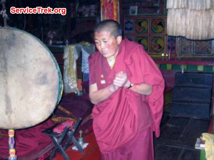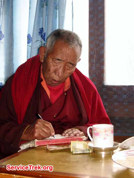 Suddenly we arrived to a village; the narrow trail became a village road surrounded by stone walls on each side. We knew we were close to our destination, and when we came around the bent we came face to face with a monk, a lama,smiling broadly. It was Lama Geshe. We were exhausted but happy meeting this amazingly mythic and remarkable man. With laughter and open arms he turned around and invited us to his nearby home for milk tea. We followed joyfullyand received a protector cord, a kata, and delicious tea. We did not have Mingma Sherpa to translate for us, so we tried our best to communicate with Lama Geshe and laughed a lot.