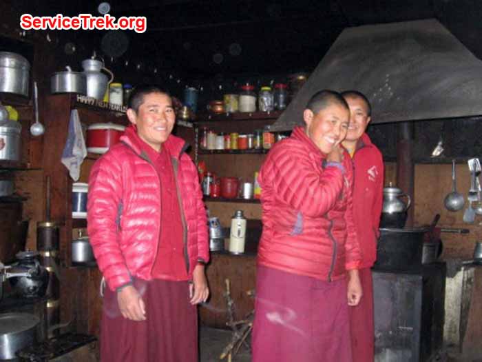 Nuns making hot milk tea in the new kitchen provided by the Mount Everest Foundation. Nuns pose in the doorway of the convent (Justin Dickinson of the Big Umbrella).