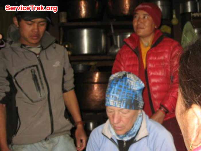The Anis treated us to a Puja, and in addition to prayers, katas and protector cords, we were offered the best traditional Sherpa meal in the world: the dal bat, rice, lentil soup, potatoes, onions, and garlic, yes, lots of garlic. It was delicious.It was such a pleasure to eat in their modest but well equipped kitchen with everyone: clients, trekkers, Sherpas, porters and the Anis. I had the dal bat before, but the dal bat cooked by the Deboche nuns, and the yak butter tea (oy!) and later sweet milk tea, were delicious. My team engaged in clearing a small field of big stones to ready it for planting potatoes. It was very hard work, and my fellow travelers did an exceptional job.