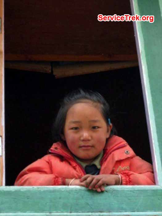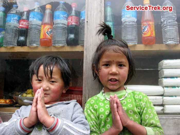 New Gompa. Trails. Children greeting to us. Foggi day . Pangboche