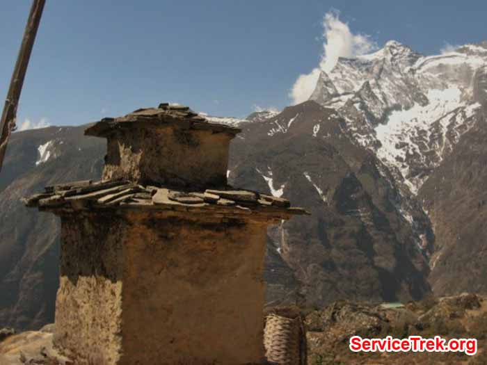 Budish stupa at Chabil chok. Himalaya and Hill Range