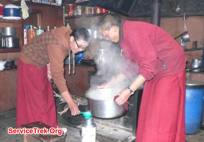 Ani Nawang Pema, the oldest and most famous of the Deboche nuns, has been meditating for 50 years (Marcia MacDonald). Anis work in the kitchen preparing a meal around their wood cook stove (Marcia MacDonald)