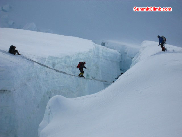 Dawa Sherpa assisting Dr. Ken Stalter from USA across a crevasse on the North Col at 7000 metres,/22,960 feet. This is the only ladder on the route to the North Col. Sherpa helping to climber crossing a ladder bridge in the Western Cwm while others hold the ropes.(squash)