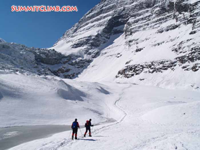 On the 14th, the members, accompanied by 4 kitchen assistants, 1 cook, and 2 climbing sherpas, climbed up to 5034 metres / 16, 511 feet, in the direction of the French Pass, and made a good camp in a sheltered, dry, flat, rocky valley with a clean flowing stream. This is where I am writing you from at this moment. The plan is to stay up here and acclimate and hike the dry moderate rocky slope up to 5800 metres / 19,024 feet, in order to further acclimate, before we climb through the rocky icefall. We are calling this our Advanced Basecamp (ABC) on the way to French Pass.