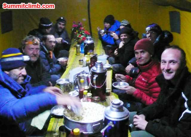After arriving in basecamp on the 11th, the members had a lovely few rest days in 4671 metre / 15,320 foot high basecamp relaxing in their warm and cozy private individual tents, meeting up in our very spacious heated and comfortable group dining tent, enjoying delicious freshly prepared meals, watching entertaining dvd's and playing several rousing rounds of cards. During the warm afternoons, we all took hot showers.