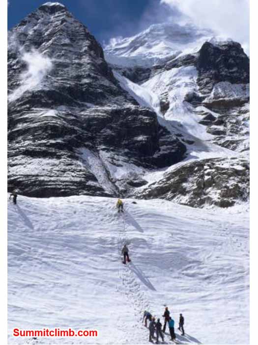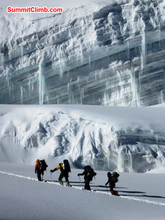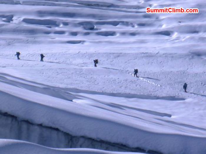 Team climbs above the Deposit Camp at 5085 metres - 16,679 feet. Photo by Arnold Coster.