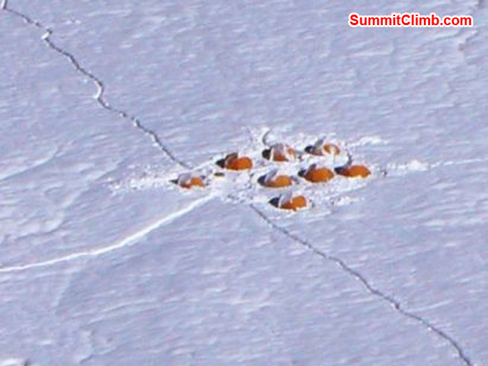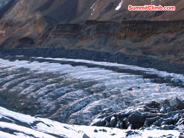 Camp 2 in the early morning after a snowstorm. Tukuche Peak in background. Elevation circa 6700 metres - 22,000 feet. Photo by Arnold Coster. The Dhaulagiri Glacier seen from above. Basecamp lies on the medial moraine in the background. Photo by Slavomir Fila.