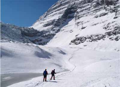 Matt Belman and Arnold Coster basking in the sun's rays just above basecamp. They are standing beneath the famous 'Eiger' altitude circa 5800 metres - 19,000 feet. Photo Dan Mazur. Team practices glacier climbing technique on a sunny day in basecamp. In Background is Mount Dhaulagiri and the 'Eiger'. Photo Dan Mazur. Arnold Coster, expedition leader, guides the team through a sunny morning of glacier training. Photo by Dan Mazur. Dhaulagiri Icefall after a new coating of snow. Appx 5000 metres - 16,400 feet. Photo Dan Mazur. back to top