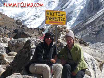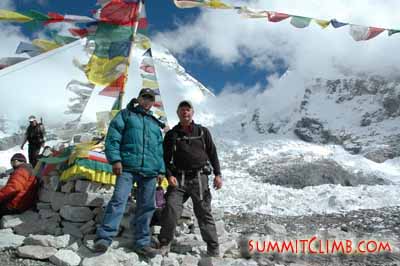 A short, but steep climb up to high camp. It was cold and starting to snow lightly. We ate in our tents and went to sleep early (photo right by Mith Wlliams): Pemba and Mitch at Everest Basecamp.