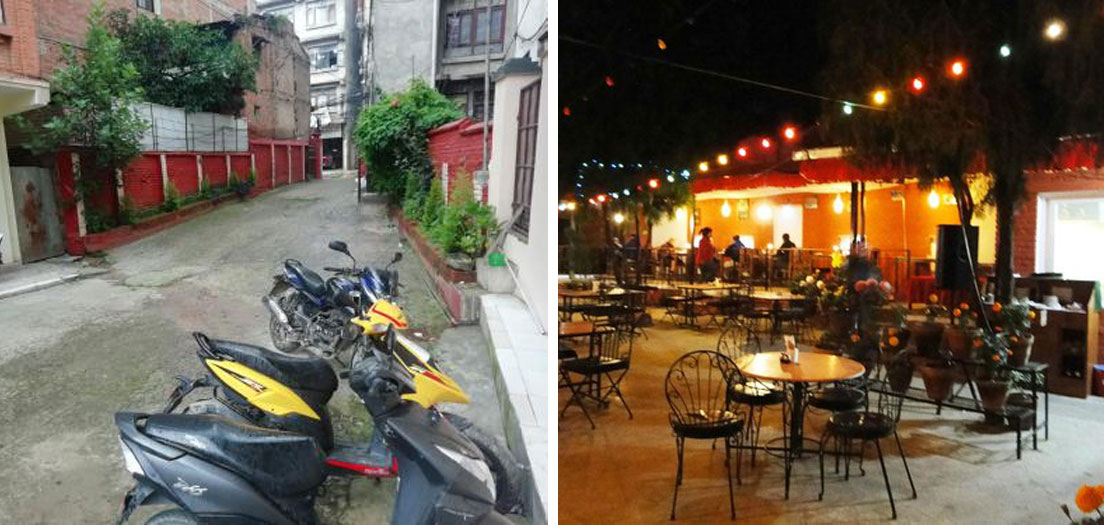 At a loss for something to do, someone suggested we walk around Thamel and have a look around. No one was on the streets, except for a few stray pedestrians a few police milling about, and a random motorbike cruising past occassionally. All the shops were closed and the metal shutters rolled all of the way down. It was past lunch time, so one member of our group, feeling hungry, suggested we visit a café near our hotel we often go to. The café was closed, but we noticed there were a few motor scooters and bicycles parked out front. On a whim, we decided to knock upon one of the rolled down shutters, and to our surprise the shutter rolled up, and a waiter at the restaurant said Namaste, the traditional Nepalese greeting, with his palms pressed together in front of him, as if he was praying, and welcomed us in.