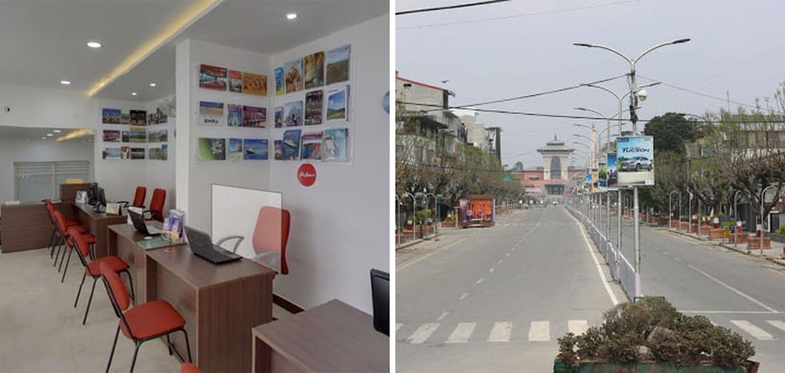 Well, we are getting a strong feeling that something has got to be done, so, we decide to move into action, and pay a direct visit to the offices of the travel agent who is meant to be organizing our flight. The agent’s office is apparently on Durbar Marg, which translates into English as King’s Street, which is in walking distance from our hotel. So we walk down some empty little roads and alleys near our hotel, and cross a few intersections. We are not seeing much in the way, of traffic,certainly very few pedestrians, no vans, buses, no cars and only a few motorbikes. As we walk we say Namaste with our palms pressed together, to several policeman guarding junctions, and they return the gesture, albeit with only one hand in a sort of sideways palm raised to their nose type of gesture. But, they let us proceed without question.