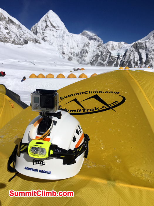 Andrew and Everest and Lhotse Background. Go Pro and Summitclimb teat at camp 1. Photo Andrew.