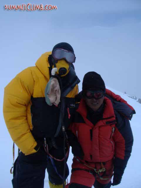Ms. Sophie Denis and Mr. Jinpa Sherpa on the summit of Mt. Everest. |