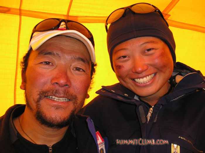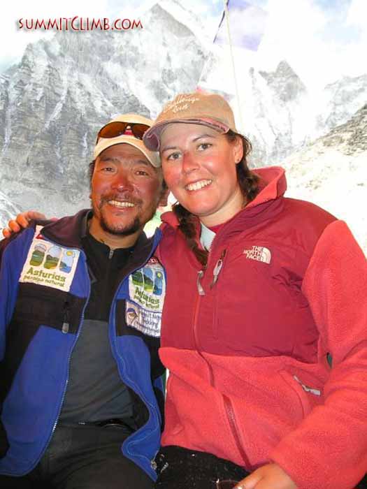 Laura Mallory and Pasang Sherpa summitted this morning at 9:00 am. The weather was perfect, sunny and calm. They returned to the south col at 4:30 pm. We congratulate them.