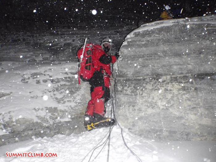 Heads down and climb was the name of the game, gradually progress was made as the hours started to tick past and height gained. The night was clear with stars and a small moon but when the wind picked up it dropped to – 35c. Still we pushed on reaching the first of the major challenges “The 2nd Step!” A series of ladders and rock climbing moves with a 1000 ft drop only centimeters to your right! Once past this obstacle we moved up onto the ridge where we changed our oxygen bottles. The problem was that I had separated from the team and so had no fresh bottle to use. I recall sitting down on the ridge at 8600 meters in freezing conditions feeling very lonely thinking my summit attempt was over! After a short time a saw a light in the distance heading my direction, it was the rest of my team! Crisis averted, I changed my oxygen regulator over and pushed on.