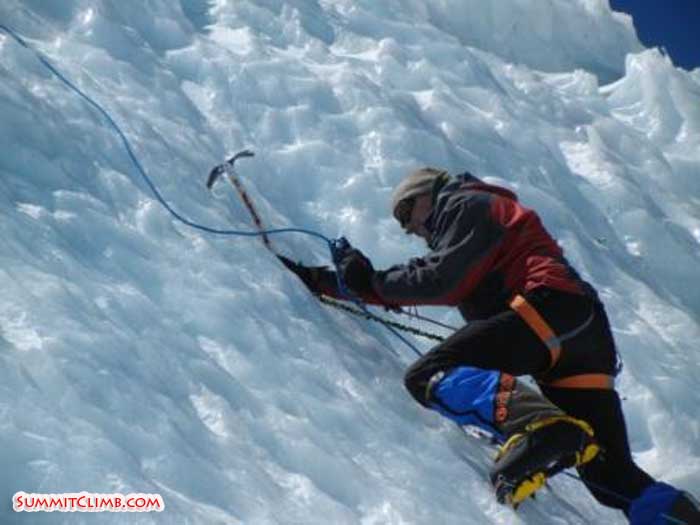 This is our third day at ABC. Today we got too wear our high altitude boots, crampons, ice-axe and harnesses. We went down onto some nearby ice-fall. The point of the exercises was too learn some techniques that could be used higher up the mountain. We practiced climbing up with the jumar and ice-axe. Once getting to the top we rappelled down on a nearby line. Once we had all done that an obstacle in the form of a knot was put halfway up the rope. This time we climbed up and after putting safety and jumar above the knot, put a figure of eight in and rappelled back down the line.