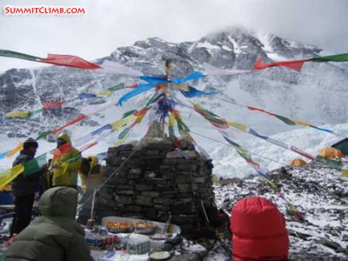 We are currently still at Advanced Base Camp (6409 meters) were today we enjoyed a beautiful Puja Ceremony. The Puja Ceremony is a important piece of our climb. During the ceremony we ask the Goddess of the mountain Chomolungma to guide us and grant us safe passage for our brief visit. We offer the goddess gifts of food, drink and candy for her blessing. We also place our climbing gear (crampons, ice axes, etc.) on the stupa and ask them to be blessed for our upcoming climb.