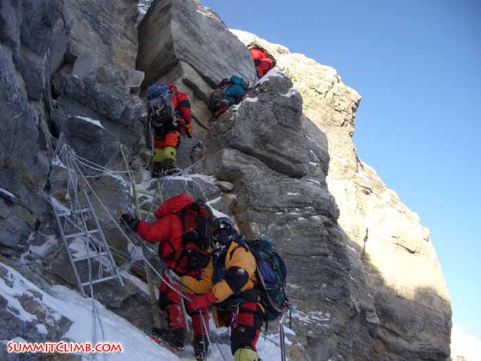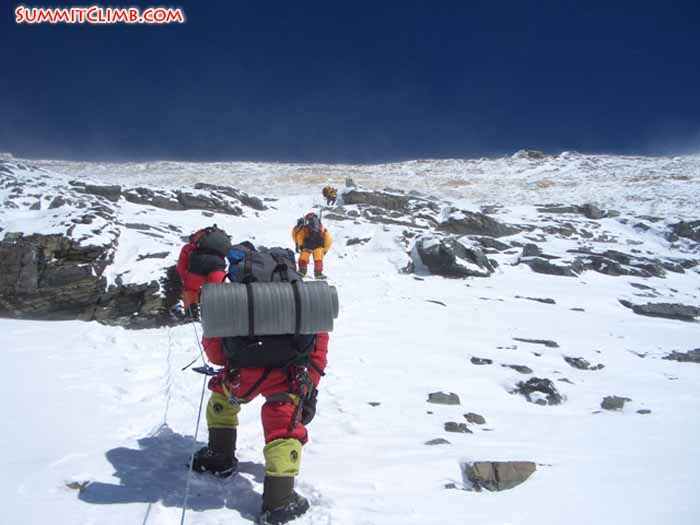 hier spricht der einzige Teilnehmer aus Deutschland in der Summitclimb Gruppe. Nachdem ich mit Sherpa Gelge und Marc erst gegen 11p.m. von Camp III aufgebrochen bin, fiel meine Stirnlampe eine 3/4Std spaeter total aus und ich konnte nur teilweise durch den Mondschein oder durch Gelge’s kurzen LIchtschein seiner Stirnlampe {durch Kopfdrehung} den Weg Richtung Nordostgrad erkennen. Den First, Second and Third Step musste ich zwischen 1:30 a.m. und 5:30 a.m. fast blind erklettern, da der Mondschein auf der anderen Seite des Nordostgrads scheinte. Auch die einfach erscheinenden Traversen auf dem Nordostgrad mit einer Trittbreite von ca 10 - 30cm bieten soviel Gefahren in der Nacht, da man trotz Fixseile 1000m -2000m zur einen oder anderen Seite abstuerzen kann. Die Fixeile haben teilweise ueberhaupt keine Spannung / Fuehrung und sind so schlecht verankert, das ein Sturz einer Person mit Gepaeck von ca 80 kg keinen Schutz bietet!!