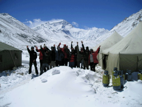 Hi, It looks like the snowstorm finally stopped today, on our third rest day in basecamp. Here is a picture of the team, including foreign members, Tibetan climbers and Nepalese Sherpas, in front of an 80 centimetre snow drift that piled up between our kitchen tent and dining tent. Evderyone is healthy and doing well, especially now that the sun is out. Thanks for covering our attempt to climb Mt. Everest! Yours Sincerely, from all of us at SummitClimb.com