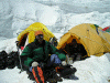 Dawa Sherpa is Dr. Ken Stalter's personal sherpa and Dawa is ready to summit. He wants to break new records and hopes to traverse the summit across to Tibet in the next 30 days or so, after his expedition duties for us are finished. Dorje Lama, kneeling in the tent, is our high altitude cooking expert. He is so amazing because he can whip up a simple yet excellent meal for a group of 15 with a basic assortment of kitchen supplies in a two person tent at a moments notice at 7000 metres.