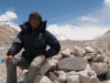 Andrew paying homage at the Boardman/Tasker memorial in Tibet-Everest basecamp. Photo Dan Mazur