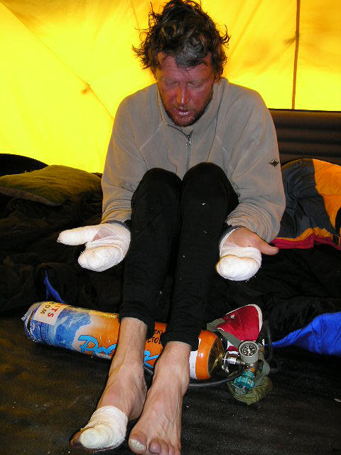 We stopped and began to talk to a man who we found out was Lincoln Hall, an Australian from the Blue Mountains. It became clear that he in fact was extremely close to death in our non-medically qualified opinions; he had sustained severe frostbite in every finger, and did not want to keep his gloves or hat on. His fingers looked like ten waxy candle sticks. His head wagged and jerked around, his beady eyes embedded in a frosty face, trying to focus on something, anything. He seemed to be in deep distress, shivered uncontrollably, and kept trying to pull himself closer to the edge of the cornice, to the point that we physically held him back and eventually anchored him to the snow. Lincoln later told us that he believed that he was on a boat, not a mountain, and that he wanted to be overboard.... i.e. 10,000 feet down the Kangshung face.