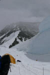 Today we are up here in Interim camp, halfway between Basecamp at 5200 metres and ABC at 6400 metres. We are having a rest and acclimatization day today here at 5800 metres. Yesterday we walked here from Basecamp in about 5 hours. The attached photo shows, from left, Bill Yeo, Olaf Sundstrom, sleeping tents, our large dining tent, and one of the the 20 metre-high ice pilgrims which are featured here in interim camp. These formations are unique to large glaciers near their terminus, and are formed by sun and wind erosion, over 100s of years. We are actually camped on a glacier covered with rocks.