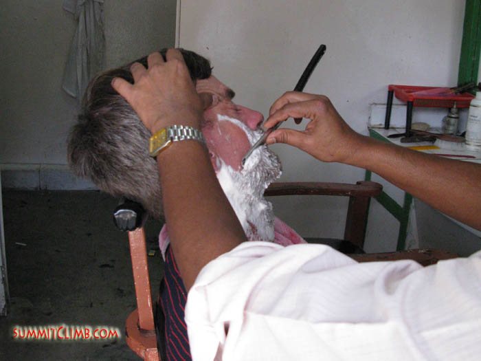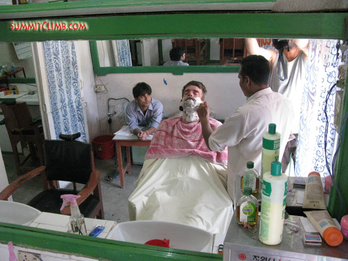 Keith getting a clean shave after the 2008 Cho Oyu expedition in Kathmandu (Erik Petersen).