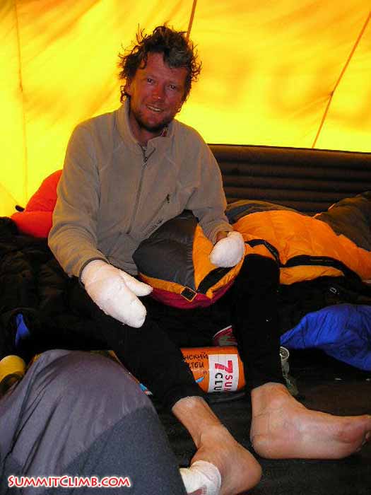 The group found he was suffering from symptoms of cerebral oedema, frostbite and dehydration, generally incoherent in his responses to offers of help. He was alone and hallucinating; without any of the proper equipment for survival in such conditions. Apparently Mr. Hall had collapsed the previous day on his way down from the summit.