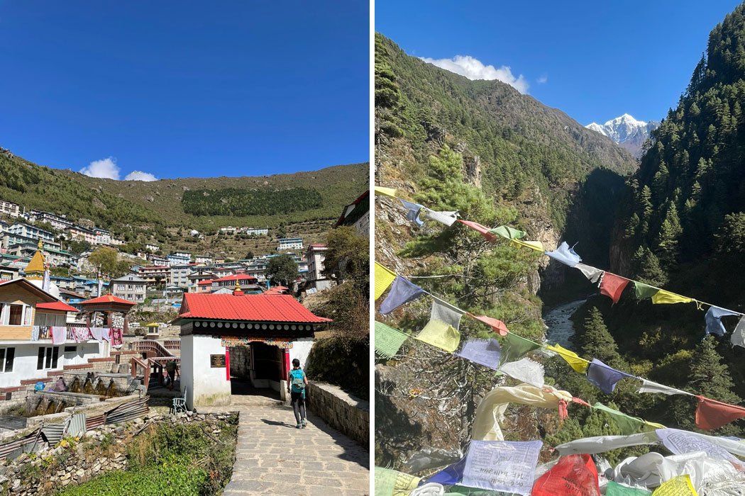 First group at Namche bazaar gate. Dudh khosi seen from far.