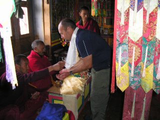 Later in the day,we visited a remote monastery shrine in a cave and received the blessings of the local Llama, who lived next to granite like a hermit, and put on an impressive performance for us, chanting, banging a drum, blowing a conchshell, and lighting butter lamps. Open our departure, he gave us each a finescarf, and we felt blessed indeed.
