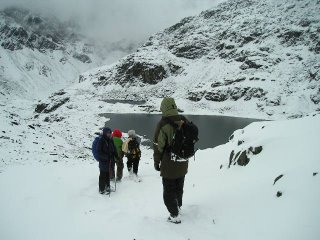 Our trekking team has arrived at Chanbu Kharka in Nepal at 4200 metres. Its cool with a light breeze. There is plenty of snow about. We are camped in a large valley with 5 crystalline lakes surrounded by high and jagged snowy-rocky peaks. We had to cross a series of 4500 metre high passes in a snow blizzard to arrive in this idyllic valley. It has been raining and snowing (up high) off and on for four days. I would say its unusually wintery this year. Hopefully the weather will break and we will have some more sunshine as we approach our destination: 6500 metre Mera peak. Our team of 6 Australians and 18 staff and little old me seem to be in good spirits so far. Wish us luck!