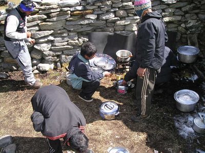 This was an exciting pass crossing to be sure, with rocky peaks encrusted in snow surrounding us as if we were in the jaws of adragon. The trail dropped us unto the valley floor at 3300 metres, so we lost over a kilometre of elevation in a very short stretch. The snow packed trail was quite slick and the porters were scared. Our climbing Sherpas Tashi and Bir Kaji were extremely attentive to everyone's safety, cutting steps in the slippery trail. Rajan Thapa, our trek leader supervised our descent perfectly. That night we stayed along the Hinku Khola River at Kote village and warmed ourselves in a comfortable teahouse.