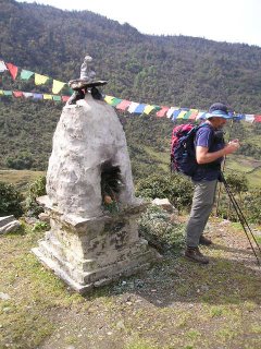 The following morning we were required to pay a "travel permission fee" to the local political group that control this region: "The Kirat Autonomous Republican Government". It kind of reminds me of the medieval city-states of Europe around here with different valleys having their own seperate governments. Nevertheless, the charge was not that high, and the gentleman who took our money was very polite and even let us take his photo. Afterwards, we began our walk and enjoyed perhaps the loveliest day of our trek yet, strolling along gentle trails in the sunshine through Juniper, Rhododendron, Heather and Ephedra clad meadows along the Hinku River, beneath the towering summits of Choure, Gonghla, and the Mera Himal.