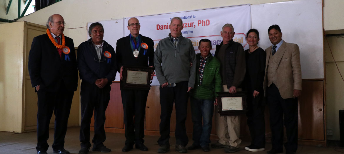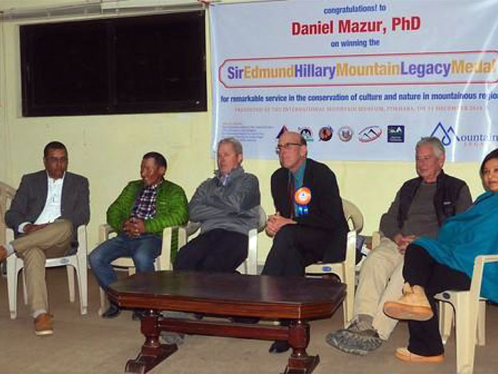 Dr. Ganesh Gurung, special advisor to the President of Nepal; Santa Bir Lama, president of the Nepal Mountaineering Association (NMA); Daniel Mazur; and Scott MacLennan, Founder and Executive Director of The Mountain Fund, and recipient of the Hillary Medal in 2010. The Nepal Mountaineering Association hosts the presentation of the Sir Edmund Hillary Mountain Legacy Medal on December 12 (the UN-designated International Mountain Day) at their International Mountain Museum in Pokhara; the presentation is a featured event in their annual Mountain Festival, which will be the subject of an upcoming article in Wandering Educators.