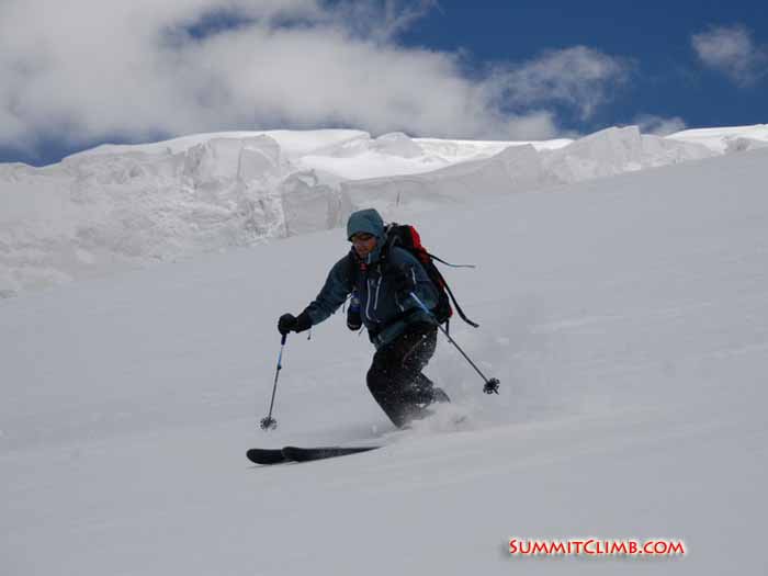 We must be getting stronger. Bill and Kaley easily walked up to camp 1 more quickly than the first time without even trying. Conditions were excellent today, sunny, not too much wind, and the snow firm enough to not need snowshoes. It's downright balmy at camp 1! Annouck, Hart, and Pierro skied up to camp 1 for the day and hit the beautiful corn snow perfectly for the descent to crank some great turns down again. At the moment it's great spring skiing! Tomorrow camp II for Bill and Kaley, camp 1 for Hart, Annouck, and Pierro. back to top