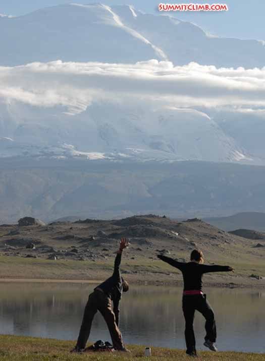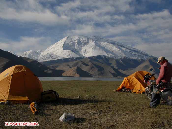 This is Mike Browder of Summit Climb on the 2010 Summit Climb Mustaghata Expedition. Today is the first real day of the expedition. We left the city of Kashgar for beautiful Karakul Lake at the base of the mountain. All members arrived in Kashgar a couple of days ago with no missing baggage or any other major problems fortunately . It’s quite a contrast between the hot desert of Kashgar and the foothills here where we even had a few snowflakes fall during a beautiful sunset. The mountain stretches out in front of us with the route plainly visible and it looks in great shape, very skiable or snowshoeable, and beckoning us upward.