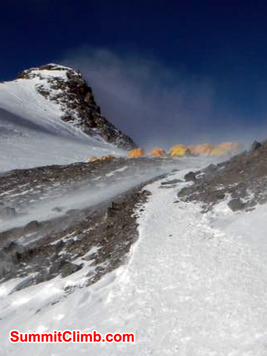 20 April - High wind strikes Everest BC. Some tents broken. SummitClimb team mobilizes. Secure camp, extra ropes. Forecast = more extreme wind.