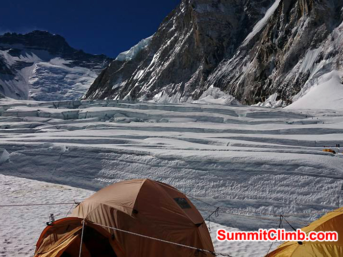 The cliffs of the yellow band straight up ahead! Tents at camp 3.Mike Fairman photo Icefall start, rope being use. Photo Klaus Johansson
