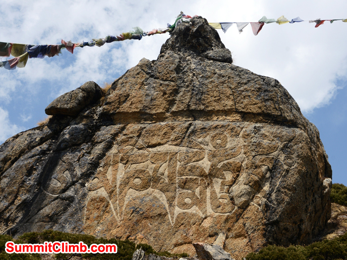Rhodhodhendrons hanging cliff face on the trail to Namche Bazaar. photo James Grieve. Photograph of an unusual coloured Mani on the trail photograph by James Grieve