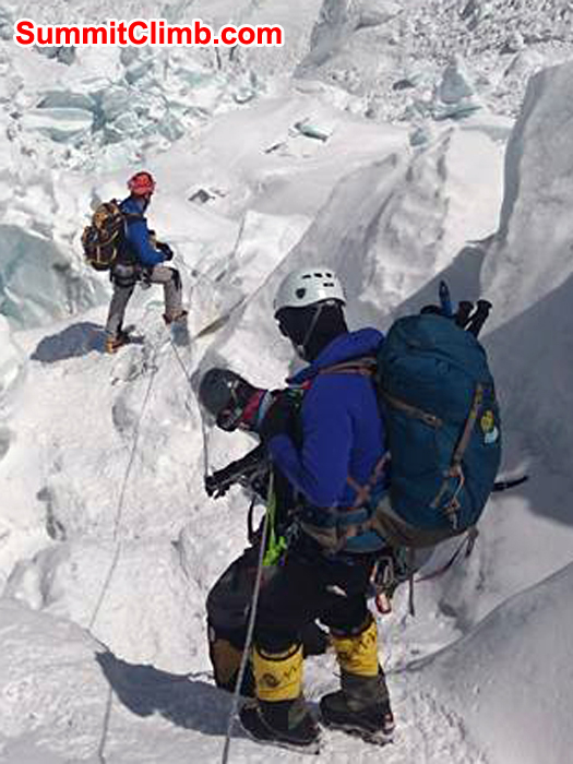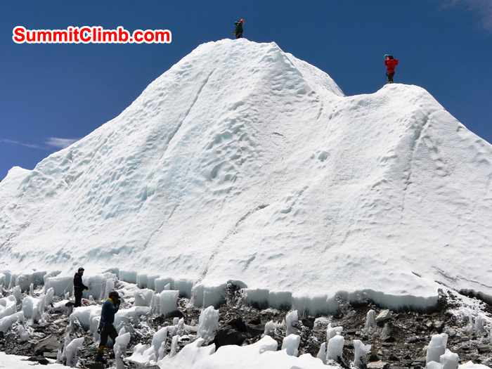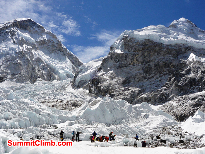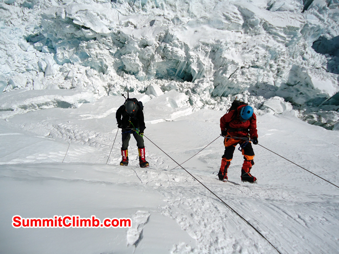 Mount Pumori and Western Cwm seen from camp 3 with rope fixing going on in foreground. Franz Ruehrlinger Photo. Team descending toward the camera. Franz Ruehrlinger Photo