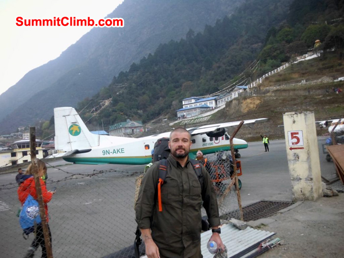 Les Binns from Yorkshire arrives at Lukla, the world's most dangerous airport. Lukla - 'World's Most Dangerous Airport' - Runway goes straight into a rock wall. Gary Ervin photo