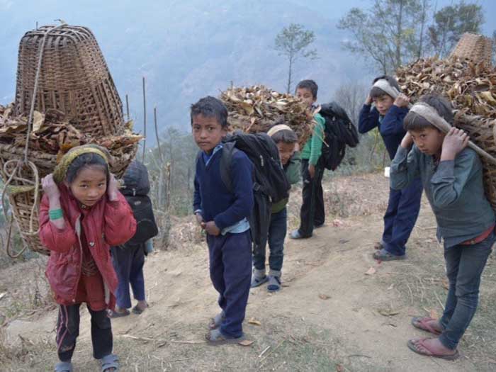 Load of stone from quarry delivered. Older children returning from their school 2 hours walk away with gathered fodder for family animals. Photo John Vavruska