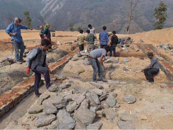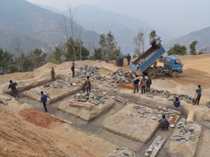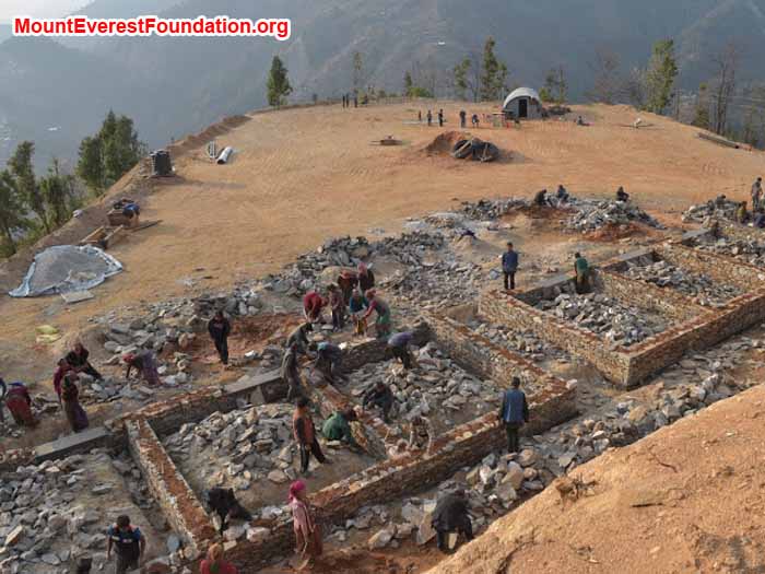 Our team arrived in the village on February 18 after gathering food and some building supplies in Kathmandu. Several days of earth moving and grading with a backhoe prepared the site for layout of the school on February 24. On February 26, the first stone was laid.