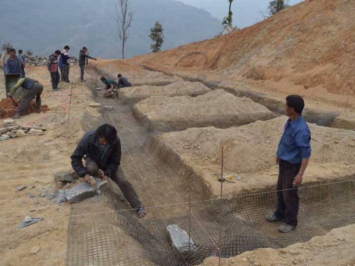 Family from Village. Thad Stewart showing how to tie the geogrid together to form a gabion band.