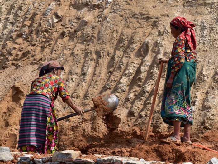 Tying gabion bands together. Women carrying firewood.